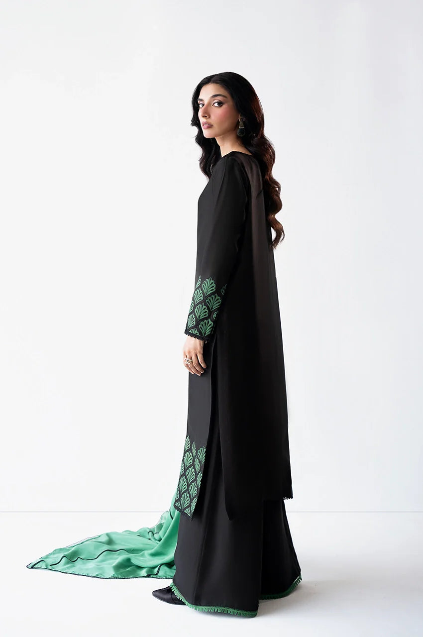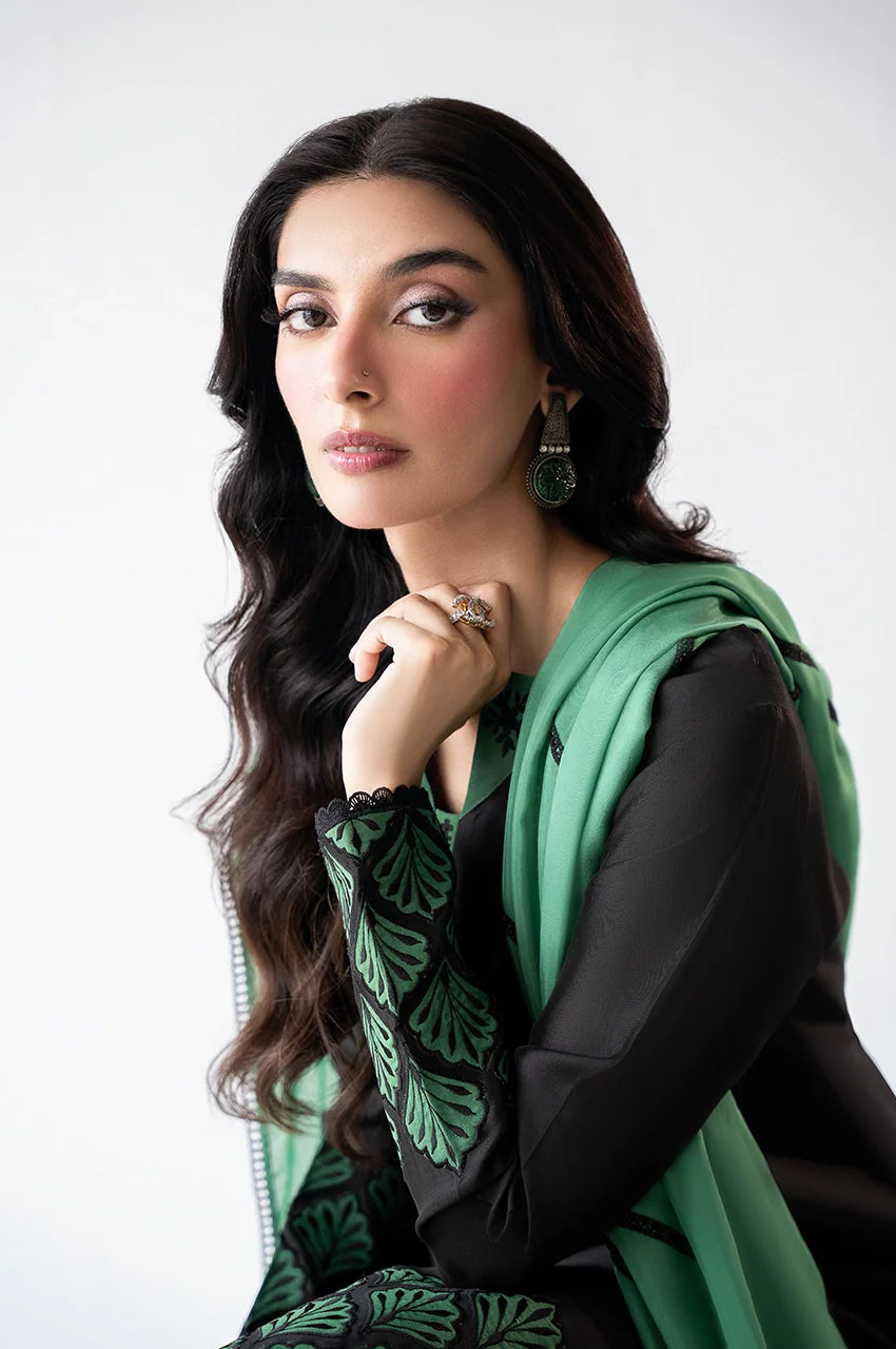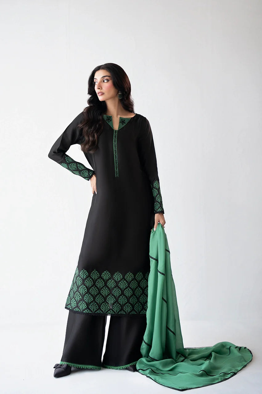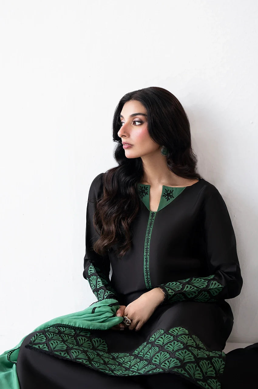 This elegant long shirt features beautifully embroidered green leaves thick border on the daman, adding a touch of nature-inspired artistry. The neckline is enhanced with intricate fabric manipulation and delicate embroidery motives for a unique, textured look. The sleeves are adorned with the same thick embroidered green leaf border on the cuffs. Paired with wide-leg pants featuring matching green lace edging for a cohesive and polished finish. The ensemble is completed with a green dupatta, enhanced with lace fabrication for added elegance.