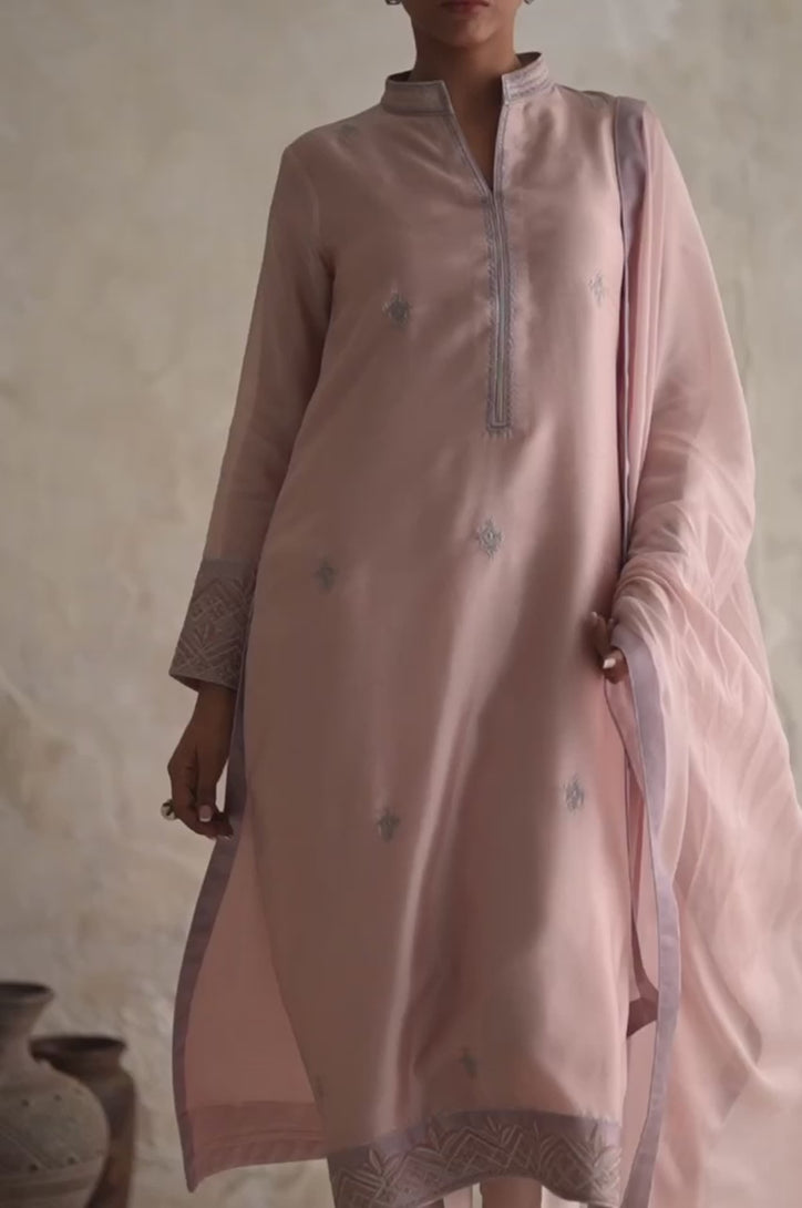 Powder pink silk embroidered kurta with pants and silk dupatta.