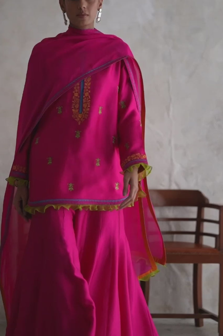 Hot pink silk short shirt with saggy pants and dupatta embroidered in three beautiful colors.