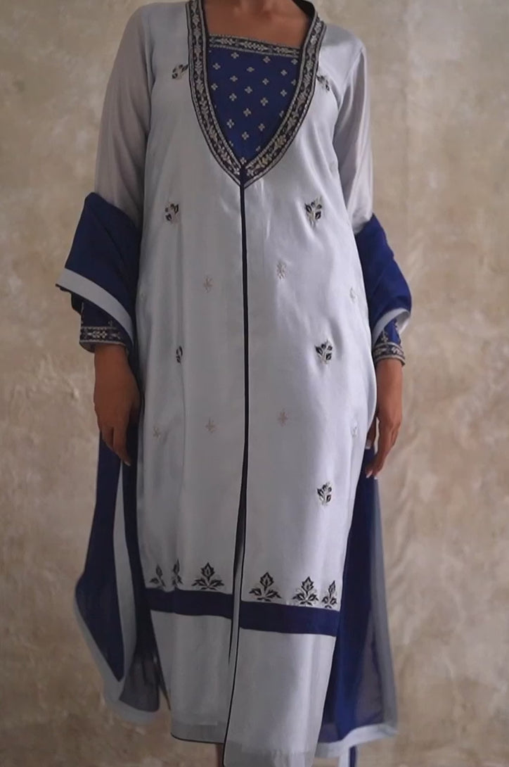 Grey blue and dark blue combo embroider silk shirt with pants and blue chiffon dupatta.