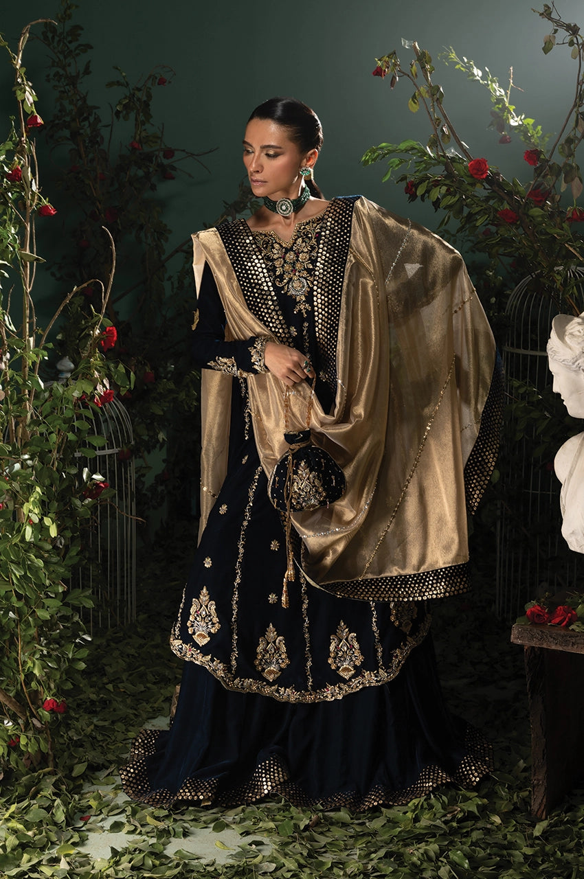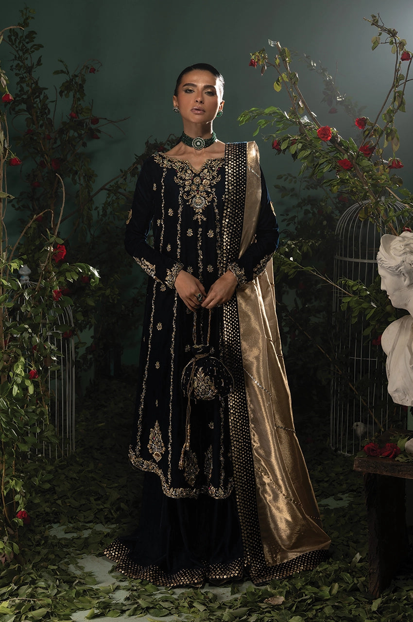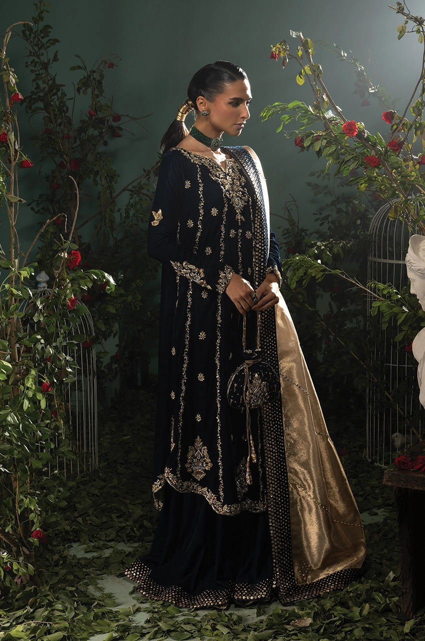 The Celestial Ember, a masterpiece by Sadaf Amir, weaves a tale of ethereal beauty. This paneled velvet kalidaar ensemble, with its flowing saggy pants and delicate pure organza duppatta, whispers secrets of the cosmos. The velvet fabric drapes elegantly, catching the light with every movement, as if infused with the fiery glow of a celestial ember.
