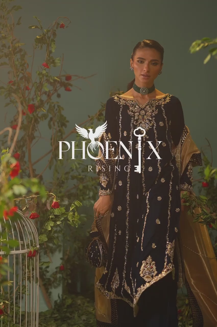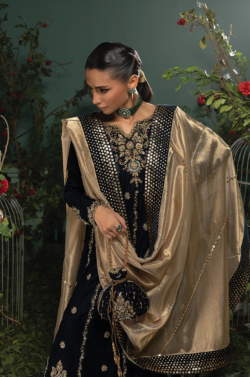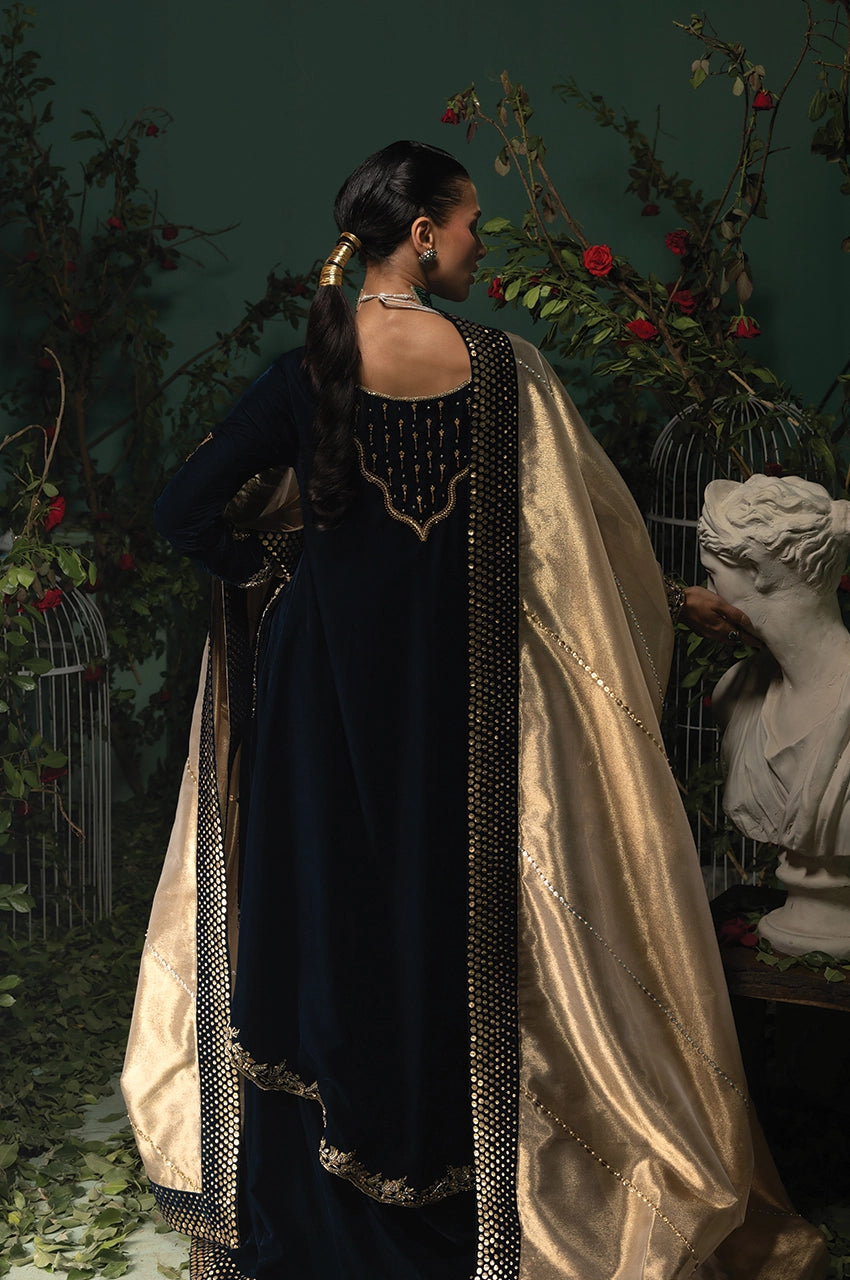 The Celestial Ember, a masterpiece by Sadaf Amir, weaves a tale of ethereal beauty. This paneled velvet kalidaar ensemble, with its flowing saggy pants and delicate pure organza duppatta, whispers secrets of the cosmos. The velvet fabric drapes elegantly, catching the light with every movement, as if infused with the fiery glow of a celestial ember.