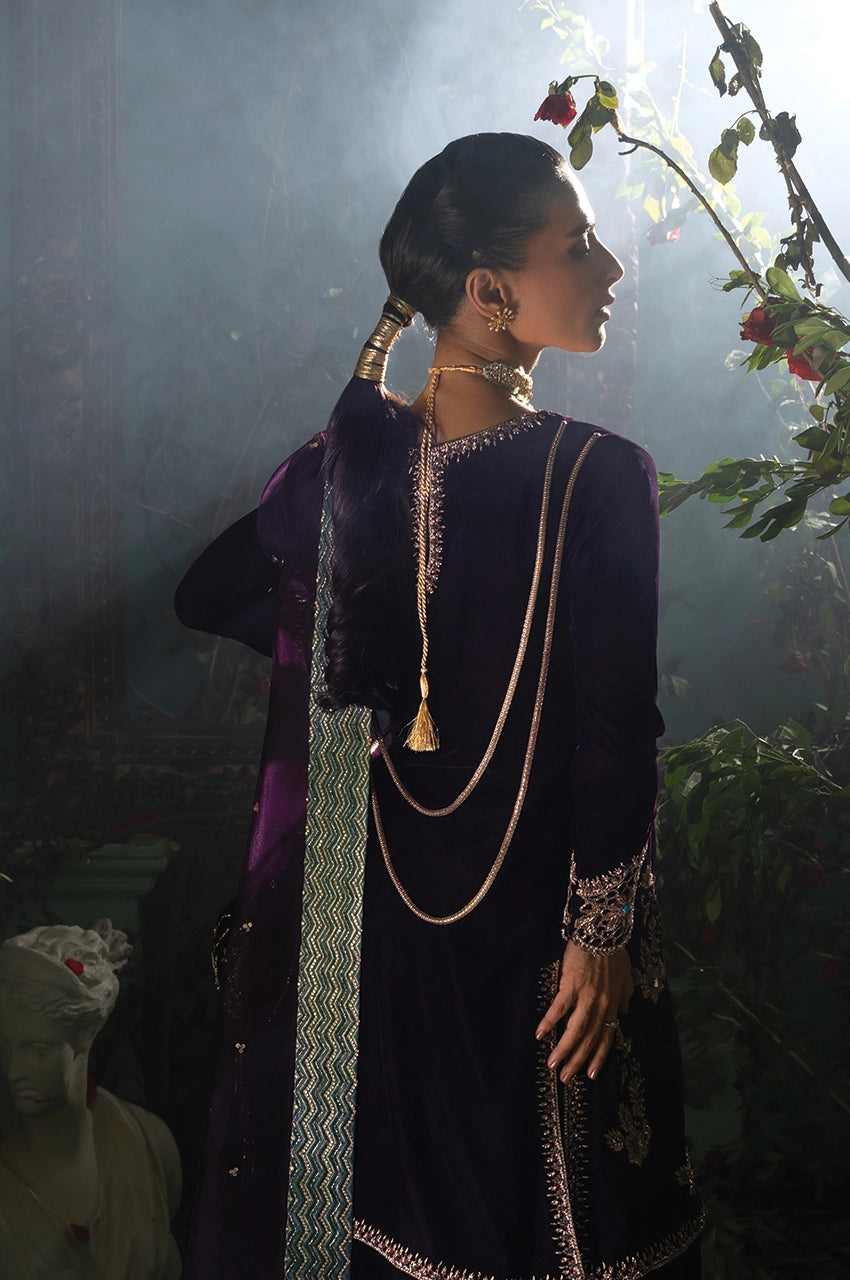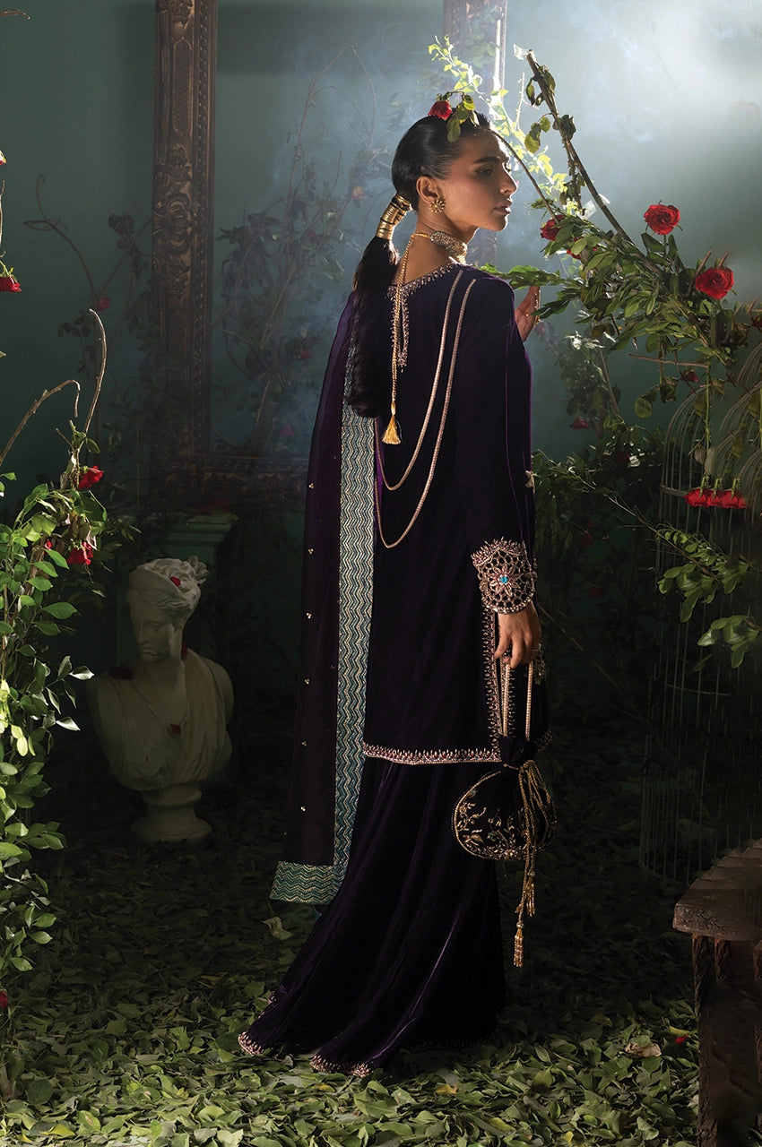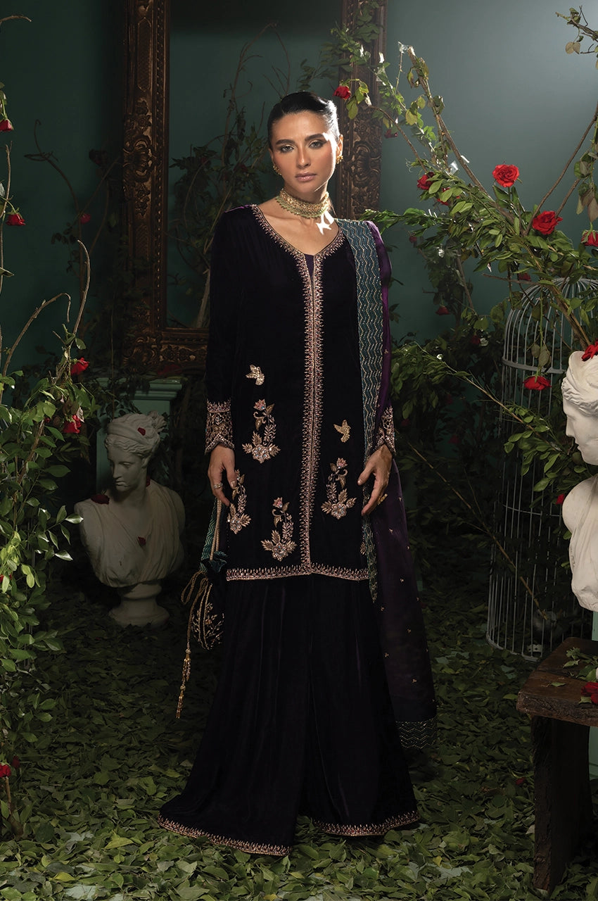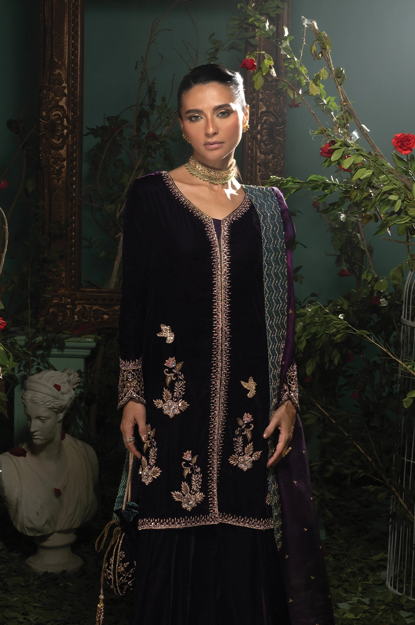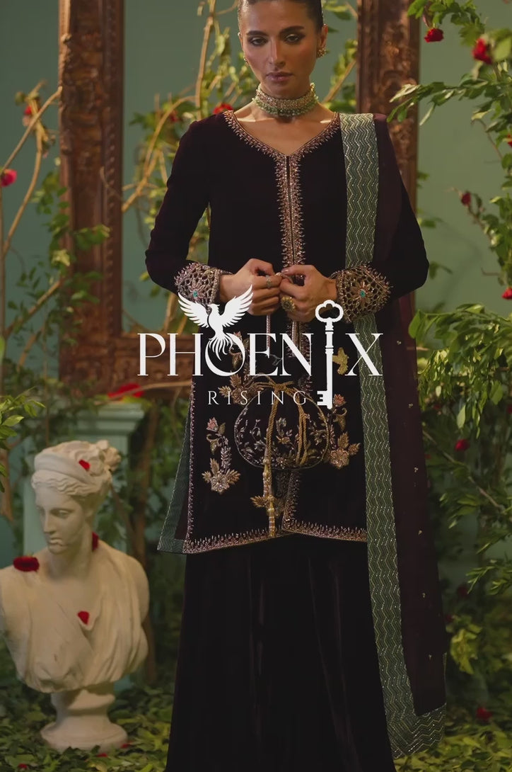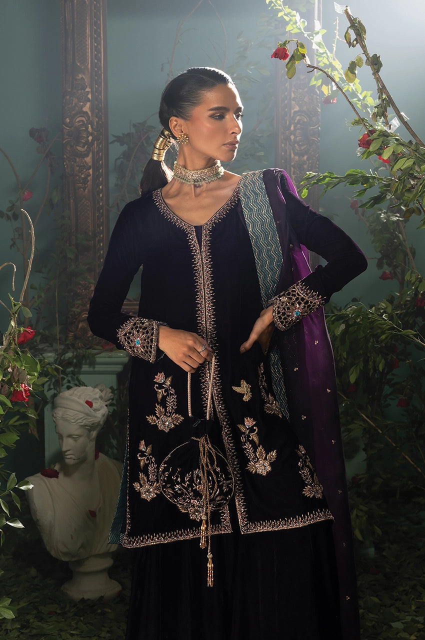 The "Eternal Bloom" ensemble, crafted by Sadaf Amir, is a stunning fusion of elegance and drama! The velvet hand-embellished short jacket adds a touch of regal sophistication, while the saggy pants create a chic, modern silhouette. The organza embroidered duppatta is the perfect finishing touch, adding a light, airy texture and a pop of intricate beauty. This look is perfect for a fashion-forward look and a style icon looking to make a statement!