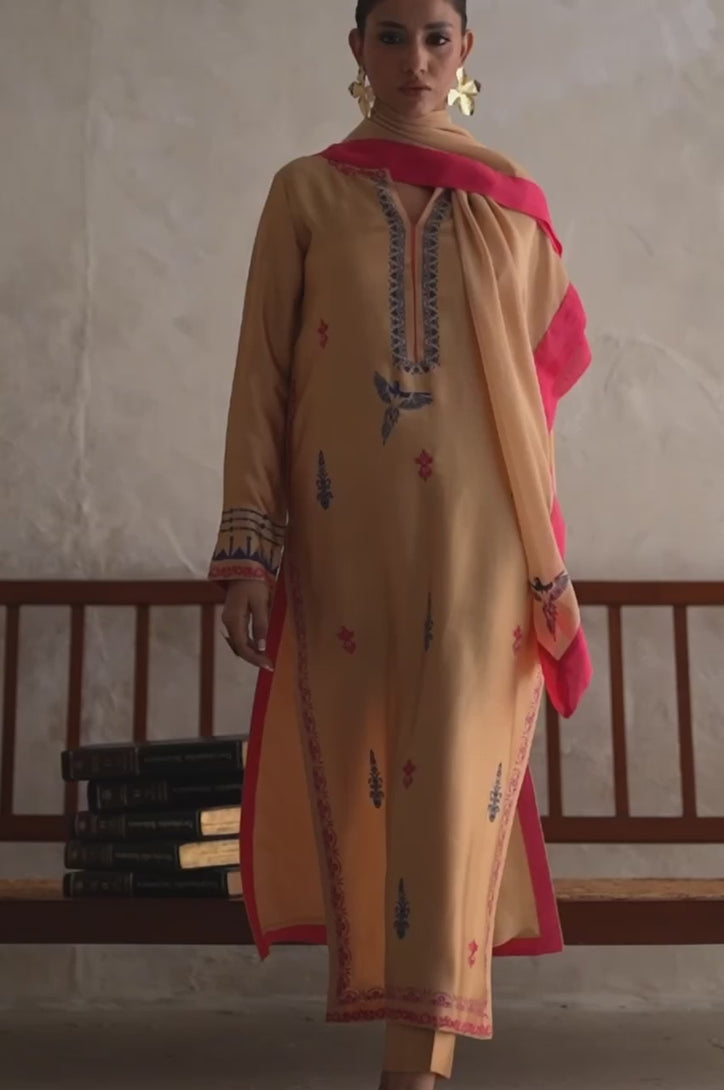Beige gold sheesha silk shirt with pink embroidery and screen printed shirt silk pants and chiffon scarf.