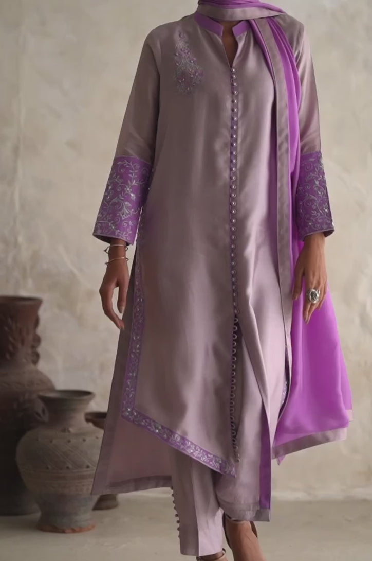 Combination of light and dark lavender color. A symmetrical silk shirt straight pants and dupatta.