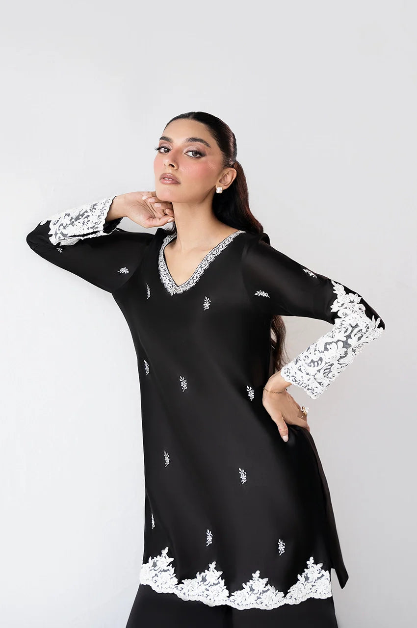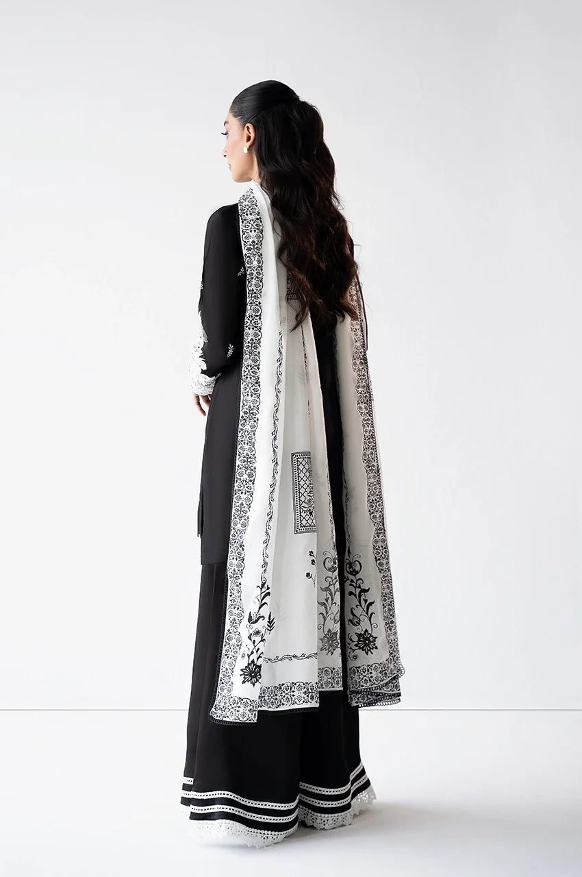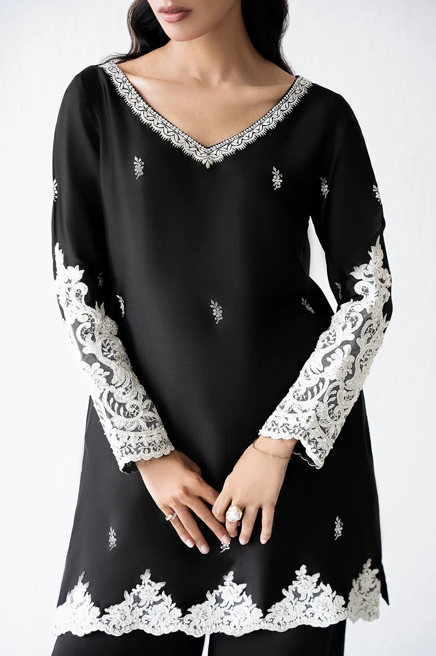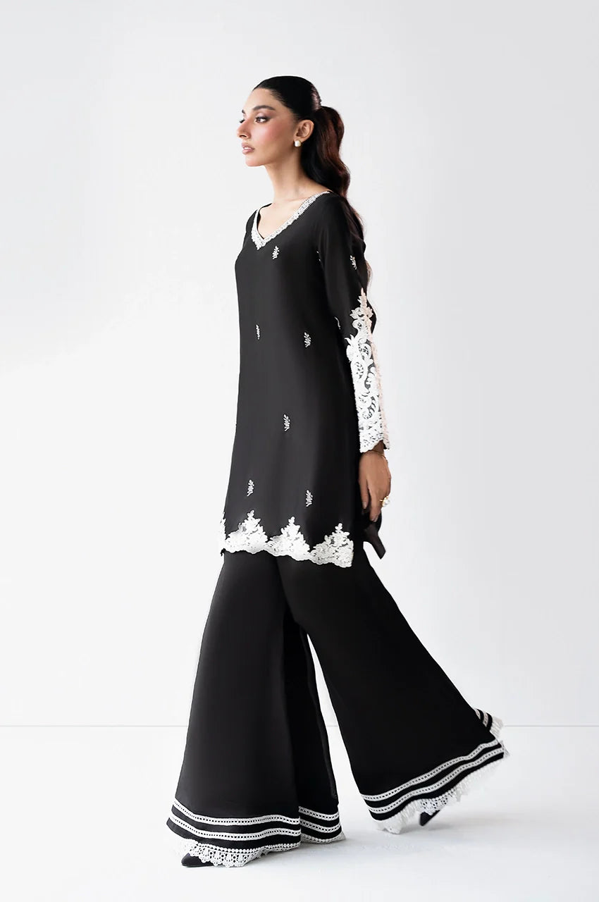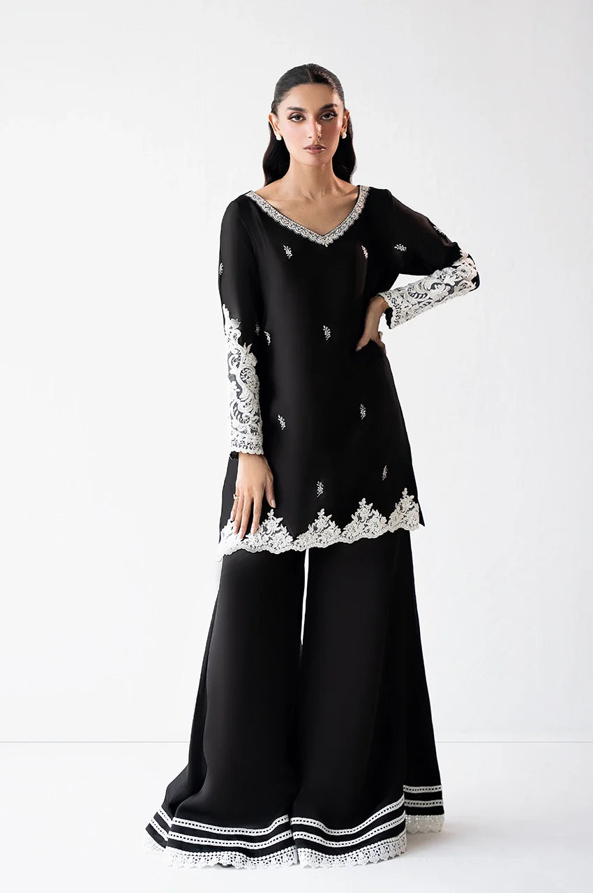 The shirt features delicate embroidery with intricate bootie motifs scattered across the front, complemented by a beautifully embriodered neckline. The cuffs and daman are gracefully finished with detailed appliqué work, adding depth and sophistication to the overall look. Paired with wide-legged palazzos, enhanced with lace fabrications and striped accents at the hem, this outfit blends elegance with effortless charm.