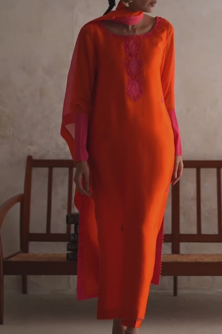 Pure sheesha silk color orange crush and rasberry pink straight shirt with pink embroidery.