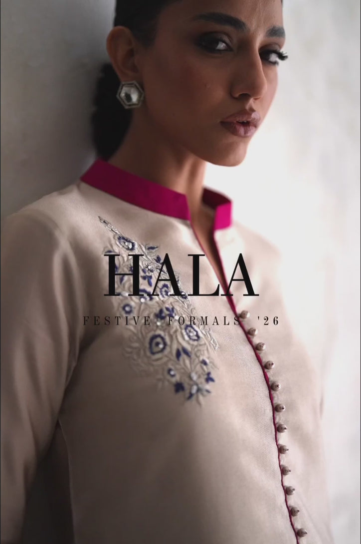 Ivory grey pure sheesha silk straight shirt with motive comes with hot pink chiffon dupatta and straight pants.