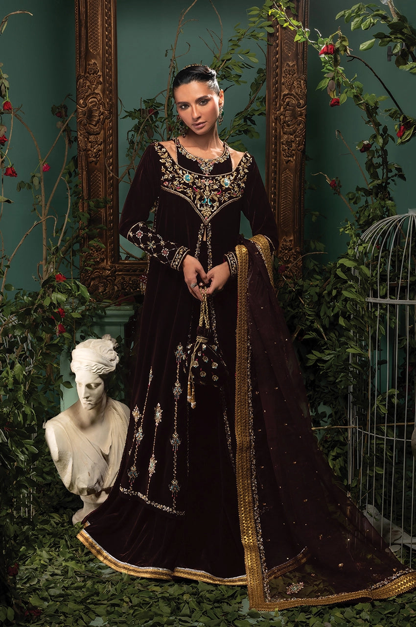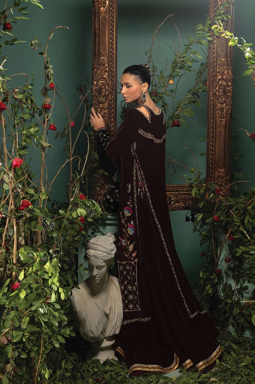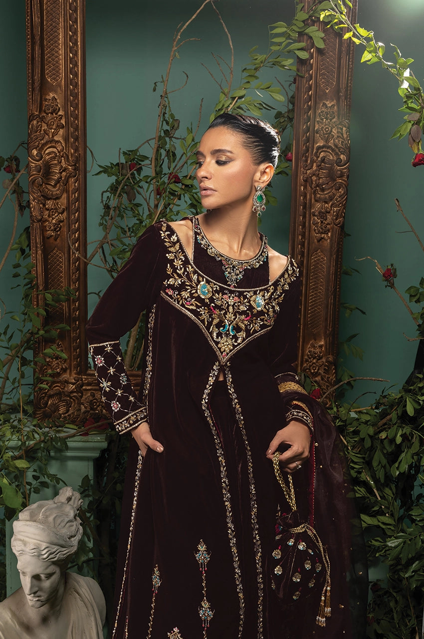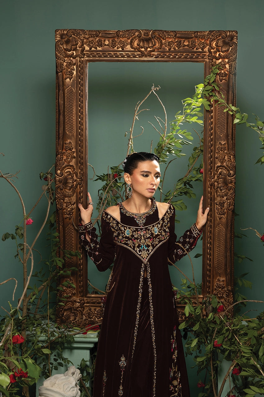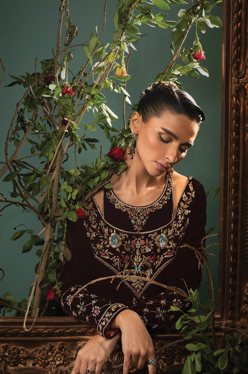 In the mystical realm of shadows, the 'Velvet Inferno' awakens like a midnight ember. Dark chocolate brown hues swirl like molten magic, wrapping around the silhouette in a front-open shirt that whispers secrets of the night. Saggy pants flow like whispers of the wind, while the dupatta trails like a comet's tail, leaving sparks of intrigue. This ensemble is a spellbinding blend of mystery and allure, where velvet darkness meets the drama of an inferno.