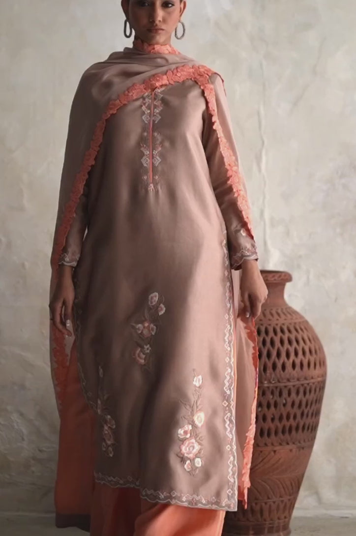 Taupe embroidered silk straight shirt with peach silk saggy pants and chiffon dupatta.