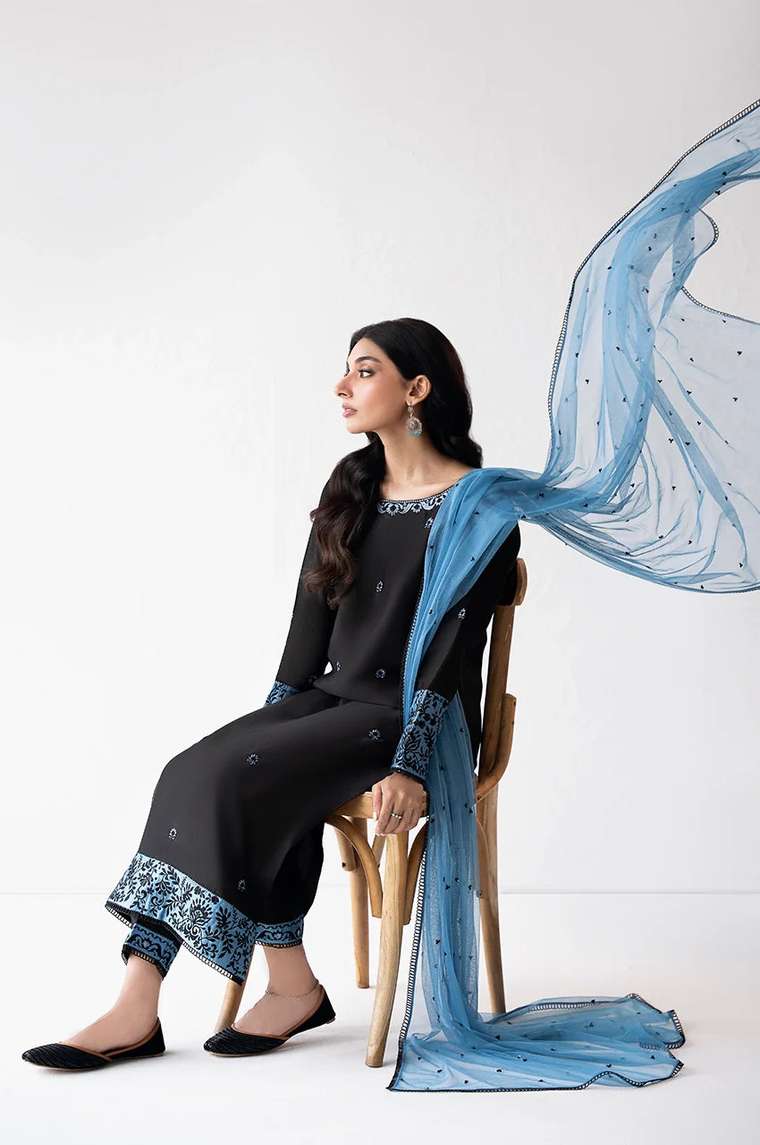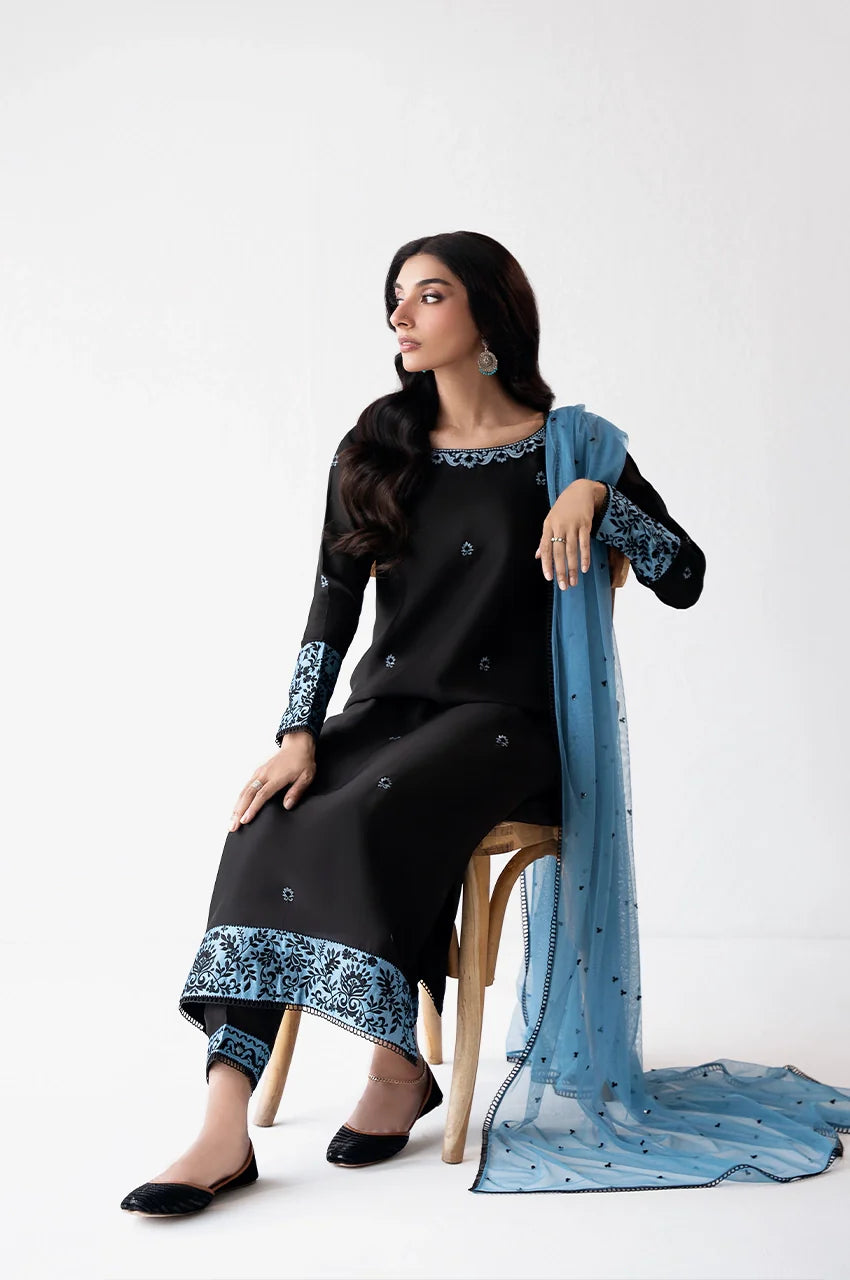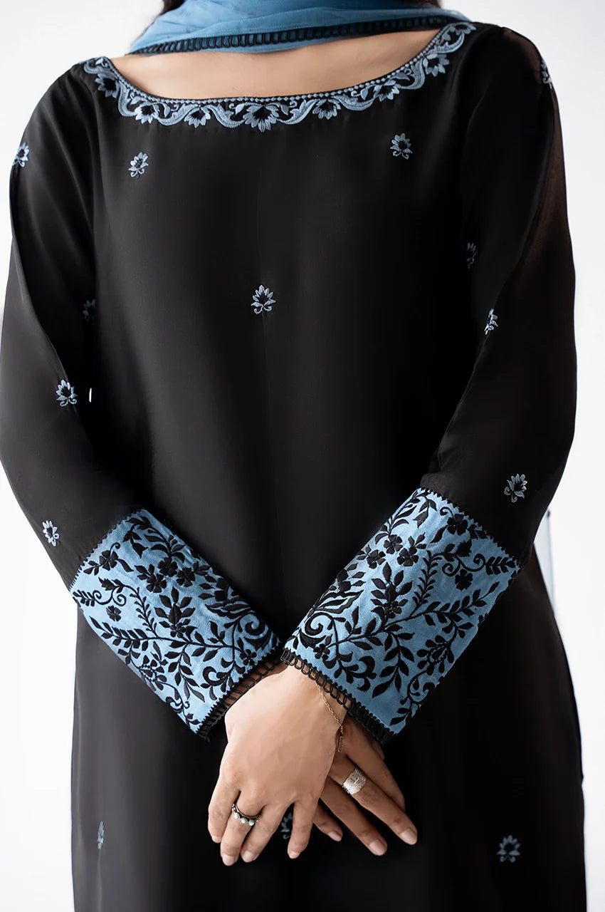 This graceful long shirt features a striking blue appliqué daman, adorned with intricate black embroidery for a bold contrast. Delicate embroidered booties are scattered all over the shirt front, adding subtle elegance. The neckline and cuffs are beautifully embellished with a blend of blue and black embroidery, enhancing the overall look with refined detail. Paired with straight pants featuring embroidered pancha for a cohesive finish. The outfit is completed with a blue net dupatta, adorned with black embroidered booties, adding a soft, ethereal touch.