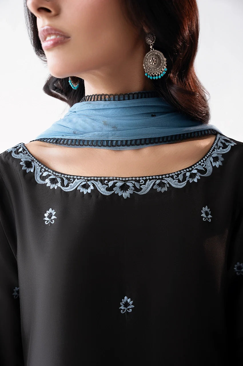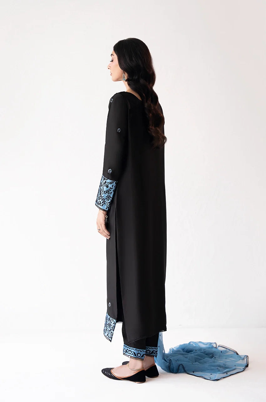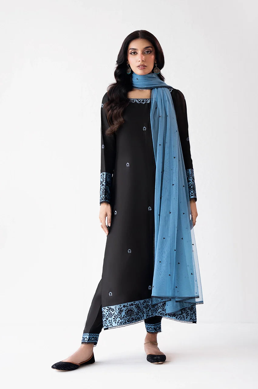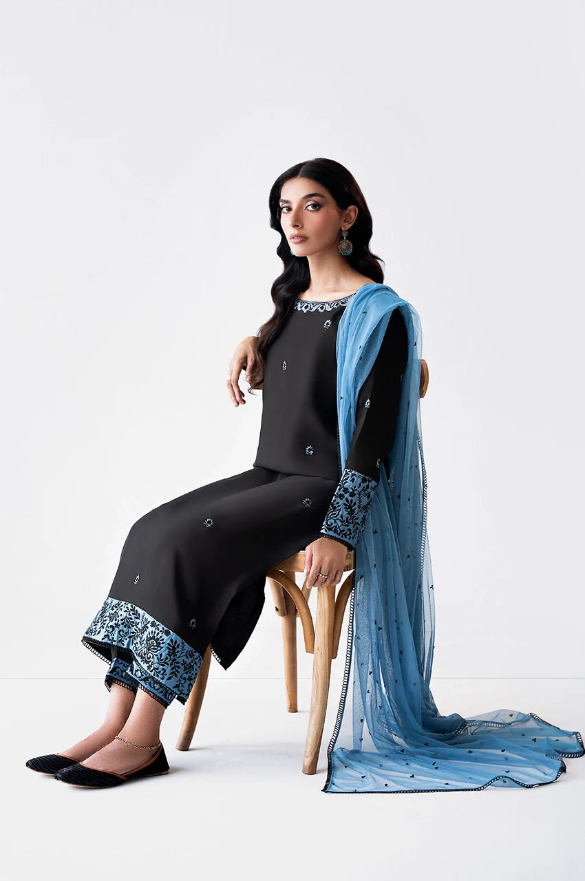 This graceful long shirt features a striking blue appliqué daman, adorned with intricate black embroidery for a bold contrast. Delicate embroidered booties are scattered all over the shirt front, adding subtle elegance. The neckline and cuffs are beautifully embellished with a blend of blue and black embroidery, enhancing the overall look with refined detail. Paired with straight pants featuring embroidered pancha for a cohesive finish. The outfit is completed with a blue net dupatta, adorned with black embroidered booties, adding a soft, ethereal touch.